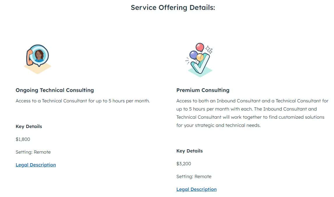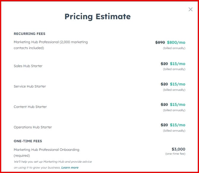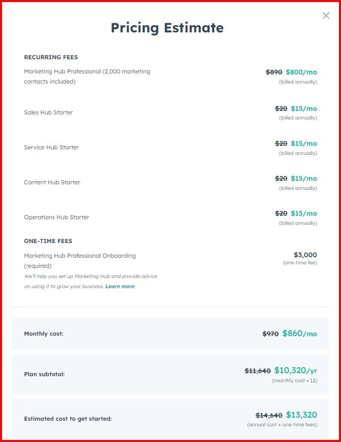 So, if you need the Professional Marketing Hub but a starter version of everything else, you can do that. BUT, once you choose a professional version of any hub, you’re locked into a yearly plan that includes a whopping $1,500 onboarding fees that you usually can’t opt out of!