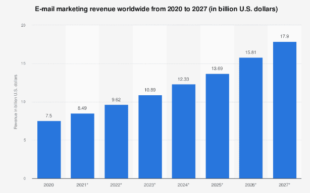 According to Statista, email users will increase to over 4.6 billion in 2023. This accounts for over half of the world’s population. And in terms of revenue, email marketing is expected to reach $12.33 billion in 2024 and $17.9 billion by 2027.