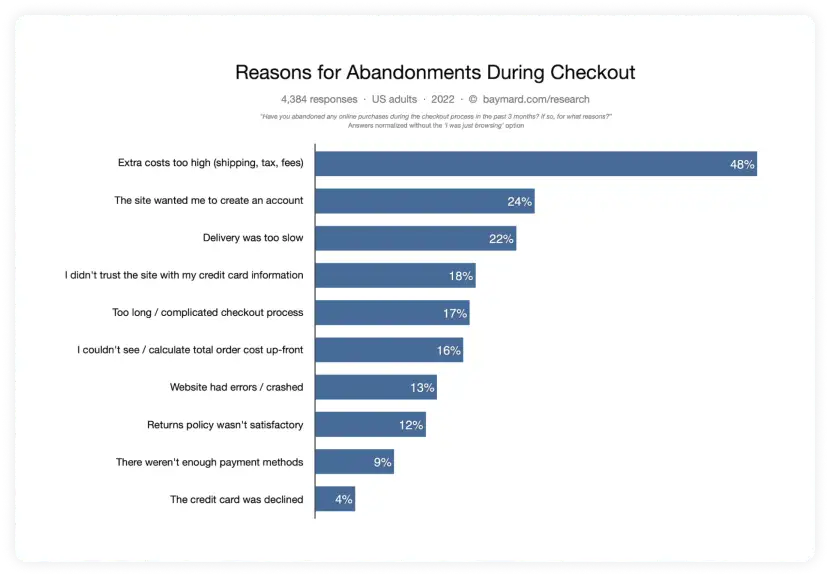 High extra costs, such as high shipping charges or taxes, is the main reason for cart abandonments. It may be important to have a survey email in your cart email series to understand your audience’s cart abandonment reasons and work to fix the loopholes.