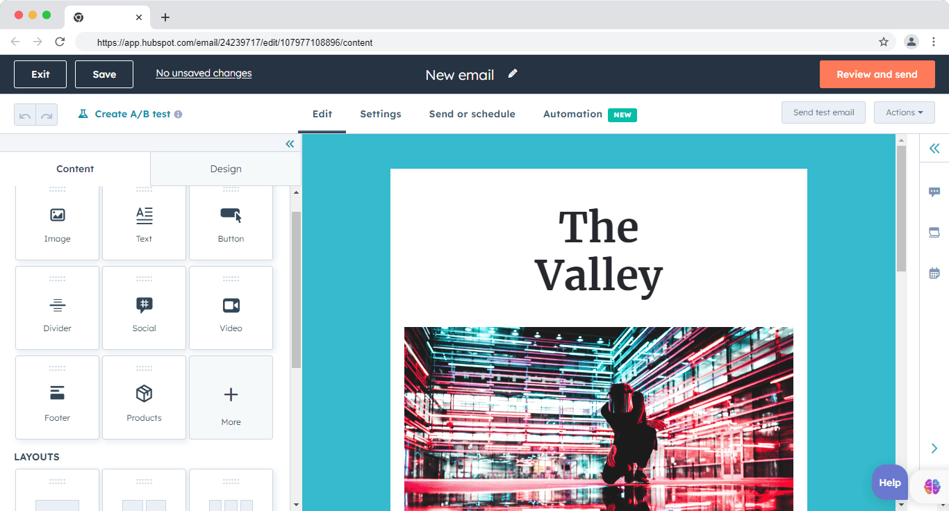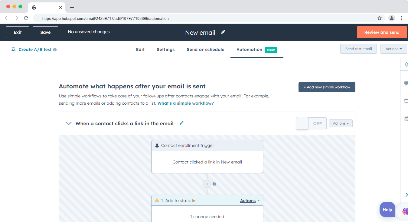 After creating your email, you can add it to marketing and sales automation right before sending the email. These workflows automate what happens after a contact engages with your email.