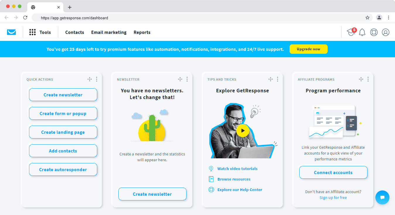 GetResponse is cheaper and good for you if you need to run simple email marketing activities. But when compared to other platforms, it’s expensive and less easy to use.