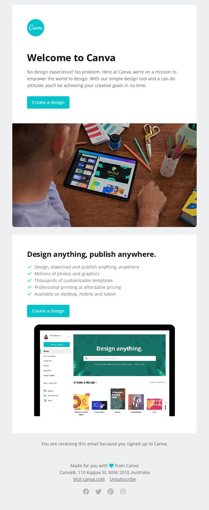 A welcome email is a series of onboarding emails sent to new subscribers – sometimes, it’s just a single email. It usually contains essential details about your company and valuable information to help recipients understand what you do, your core values, and your offerings.