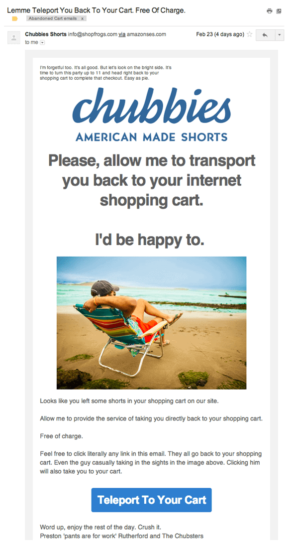 We wrote about Chubbies before, and we like the wording of their abandoned cart email. It’s playful and makes it sound like the company is doing all the work for you, hoping you’ll check out and complete the purchase.