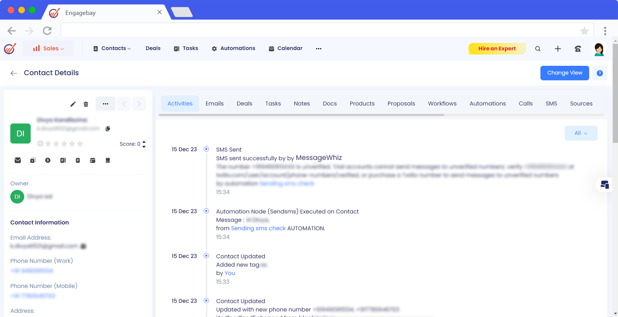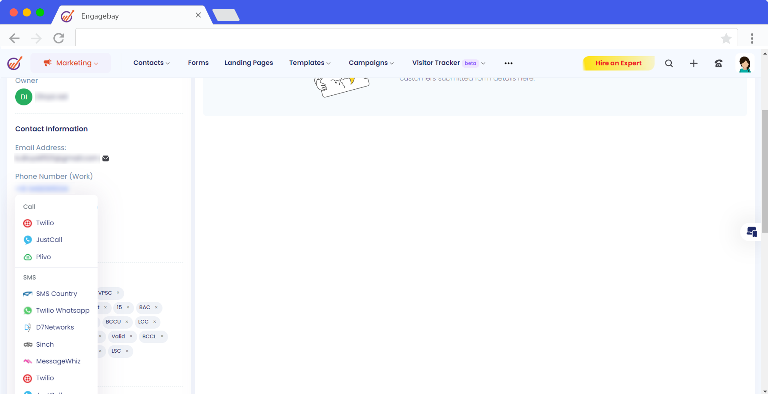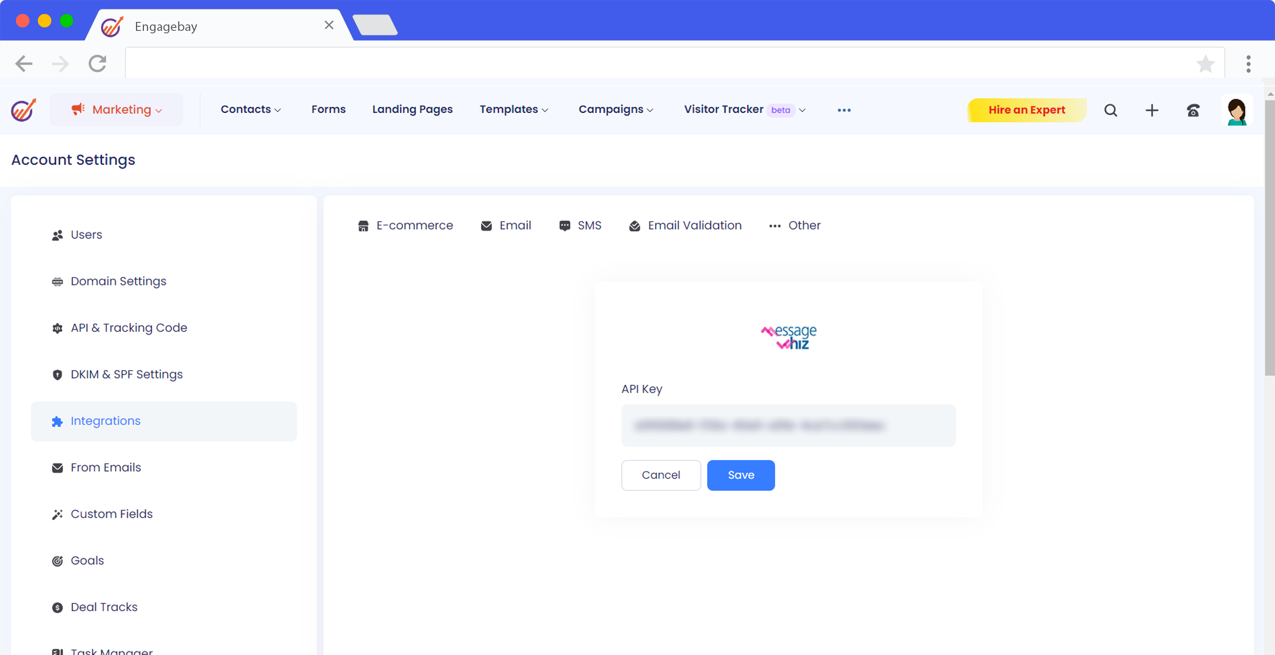 Unlock advanced SMS marketing within EngageBay CRM through the integration with MessageWhiz, featuring a pay-by-conversion model. This integration allows you to enhance communication with clients using timely, relevant SMS messages, boosting your business conversion rates significantly.